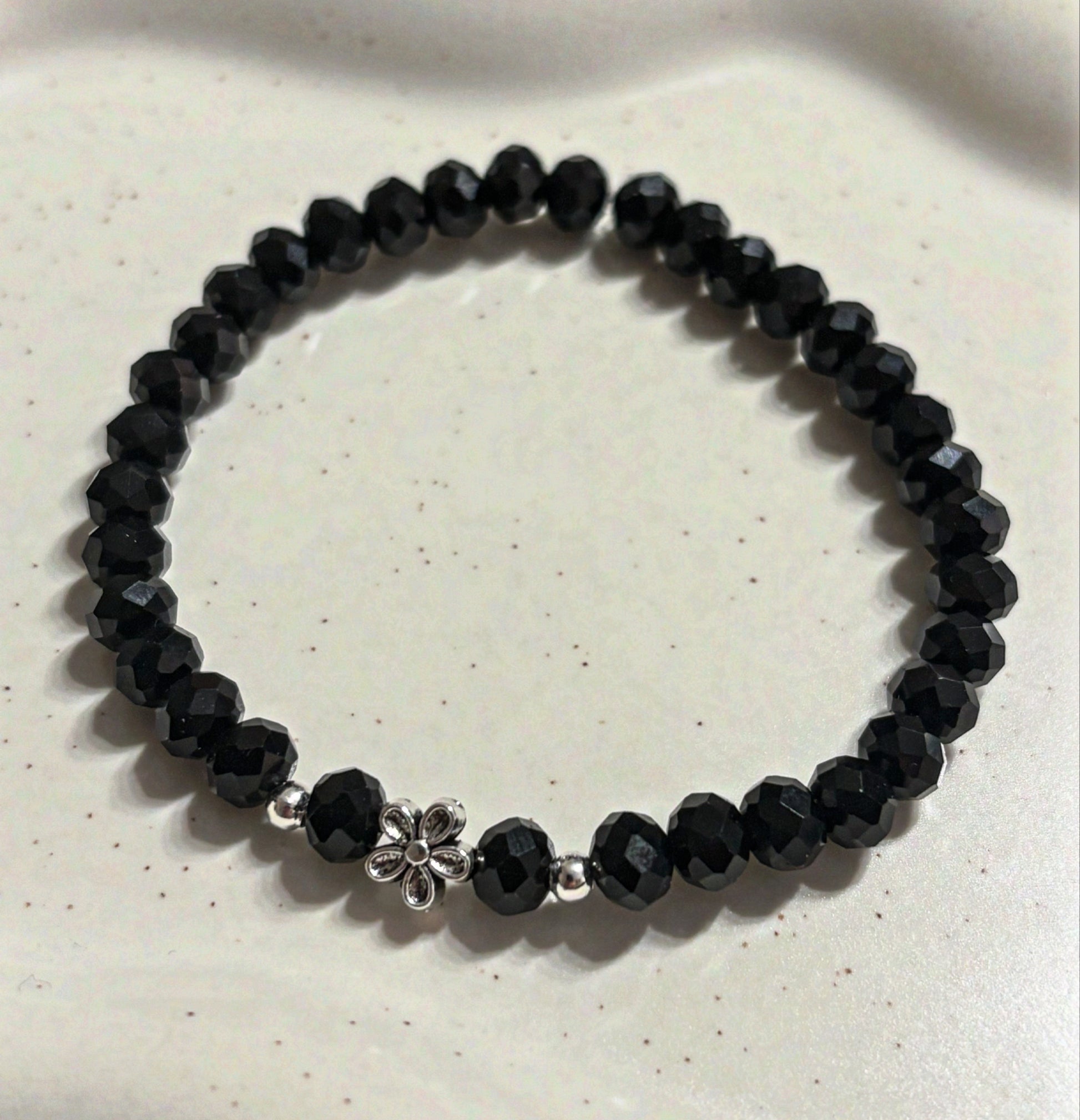 Die schwarzen Perlen funkeln bei jeder Bewegung, während die kleine silberne Blume einen femininen Akzent setzt.