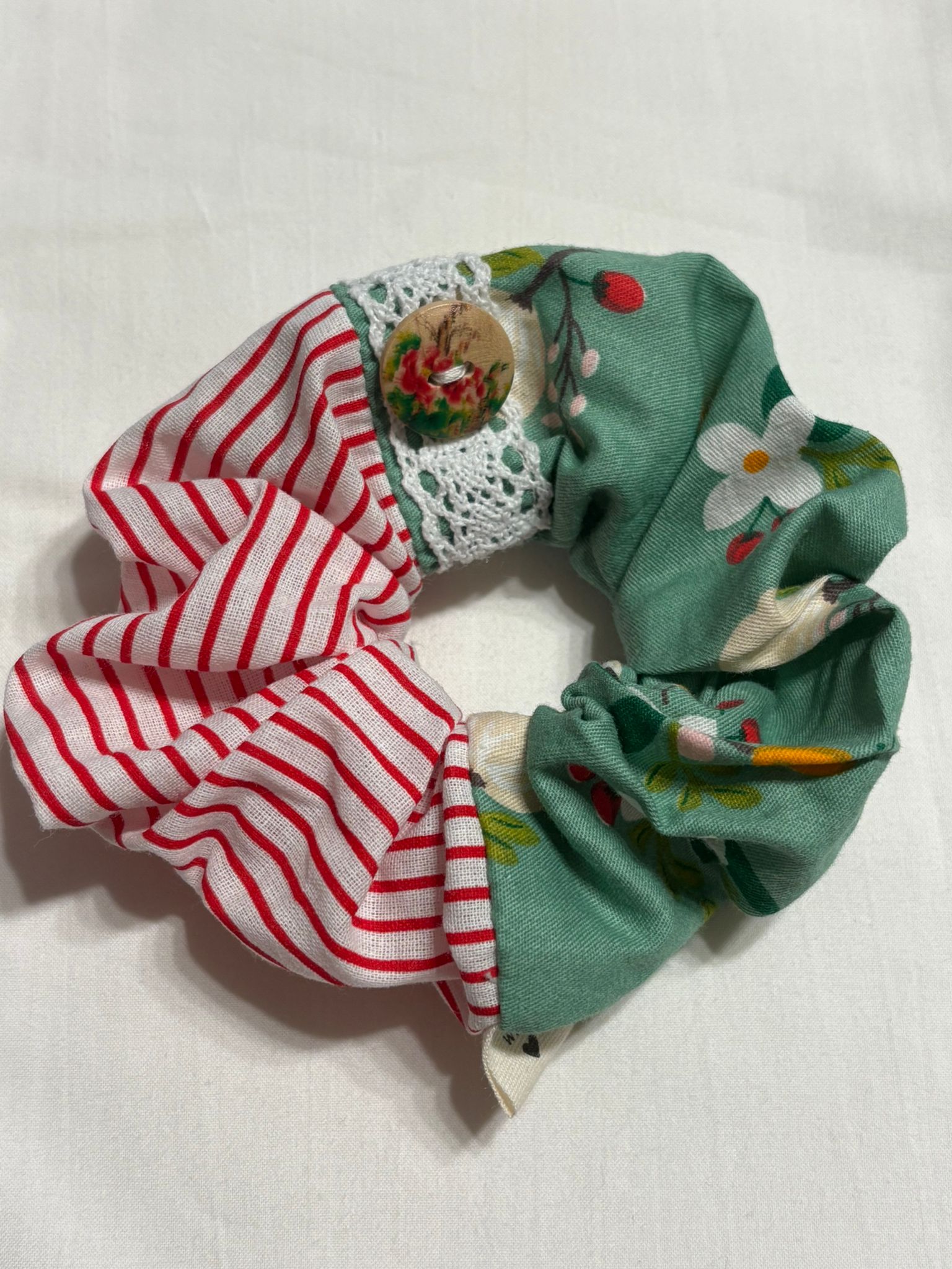 Scrunchie Handgefertigt aus 100 % Baumwolle Grün und Rot mit Blumenmuster