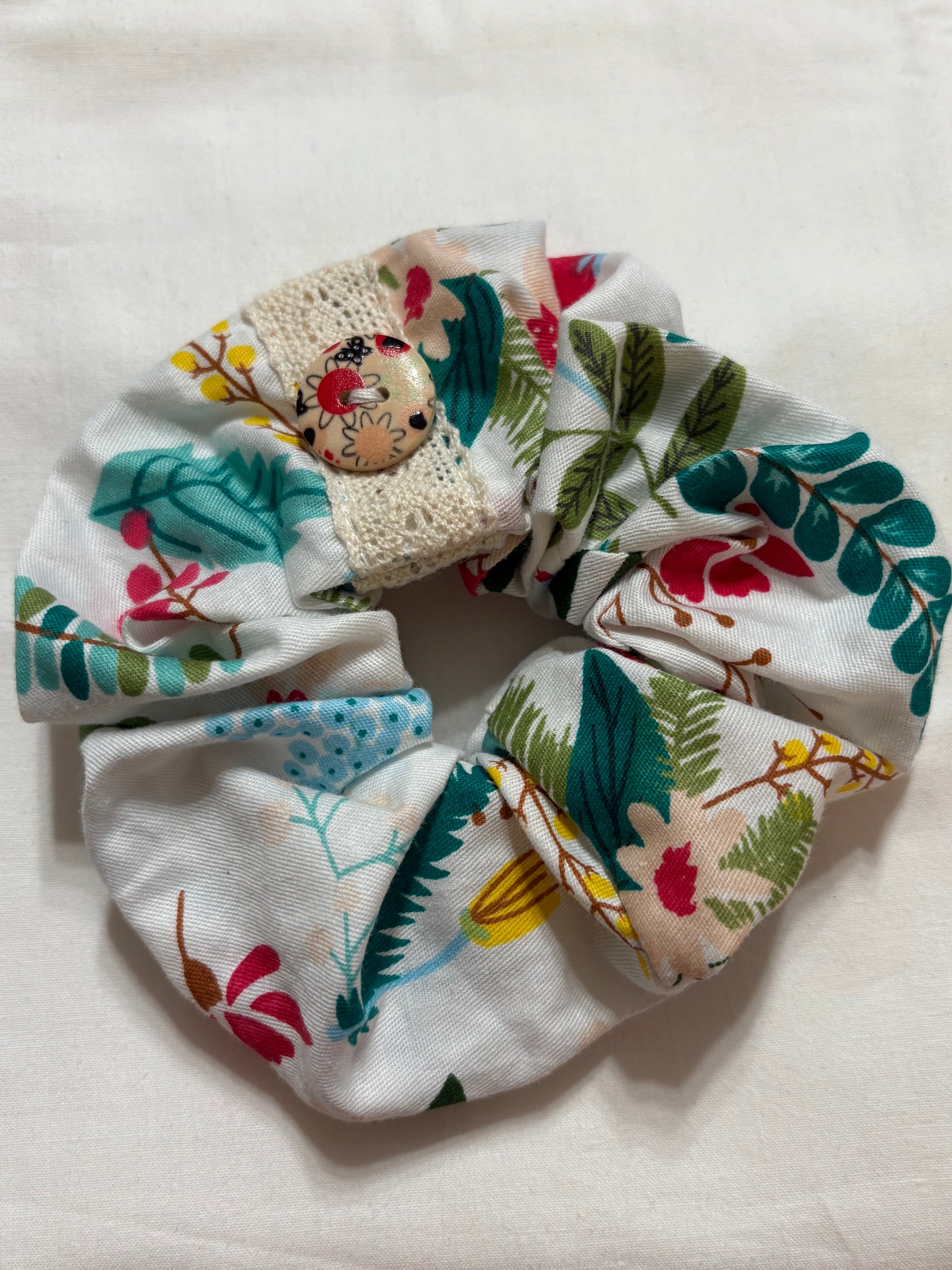 Scrunchie Handgefertigt aus 100 % Baumwolle weiß mit Blumen